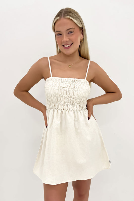 The 'Classic Shirred Mini Dress Oat' is a super cute look for summer! Here we have it paired back with the 'Denmark Chunky Slide', the 'Le Danzing // Tort ', the 'Chloe Necklace Gold', and the 'Look Both Ways Bag Tan'
