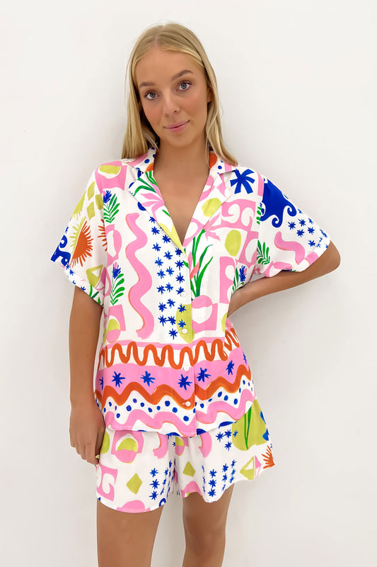 Be bright and bold in the 'Porto Set Mercedes'! This outfit features a collar shirt with button up closure and short sleeves. Shorts are perfectly fitted with an elasticated waistband and side pockets for all your essentials. Add a fun pop of colour to your look with the bright bold print throughout! Pair it back with the 'Boss Flatform Slides Caramel', the 'Glued To You Bag Tan', and the 'Jaya Chain Necklace Gold'.
