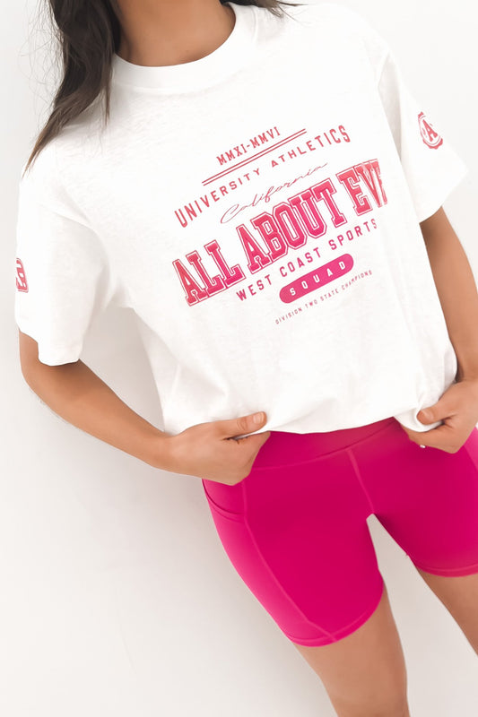 The 'Drew Sports Tee Vintage White' is an oversized, light and comfortable tee that pairs perfectly with the AAE 'Active Bike Short Rose'. Add the Reebok 'BB 4000 II Shoe White Chalk', the 'Huzzah // Black' sunglasses, and the 'Elena Hoops Gold' for a pretty in pink athleisure look!