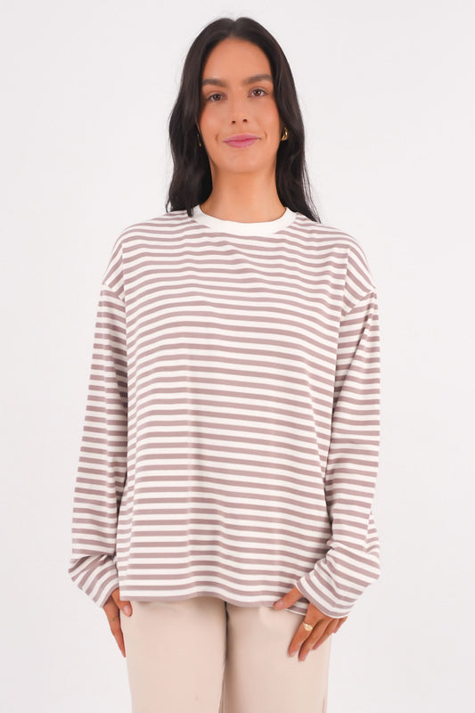 The Arlow Long Sleeve Tee in Brown Stripe blends comfort and style with its soft, breathable fabric and relaxed fit, paired here with the A 95 Super Baggy Jean in Gigi. Finished with BY.ZAH’s Eva Sunglasses in Tort, the Ethereal Bag in Cocoa, Thelma Flatform Slides in Chocolate Brown, and accessorised with the Nadine Necklace, Rachel Sleepers in Gold Crystal.