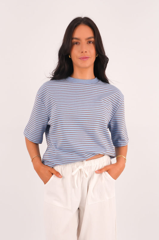 The Campbell Stripe Tee in Blue features a classic striped design and a comfortable fit, paired with the Logan Pocket Short in White. The look is completed with BY.ZAH’s Eva Sunglasses in Tort, the Solus Bag in Chalk, Thatcher Platform Slides in Chalk White, and gold-toned accessories including the Clairette Necklace and Rachel Sleepers in Gold Crystal.