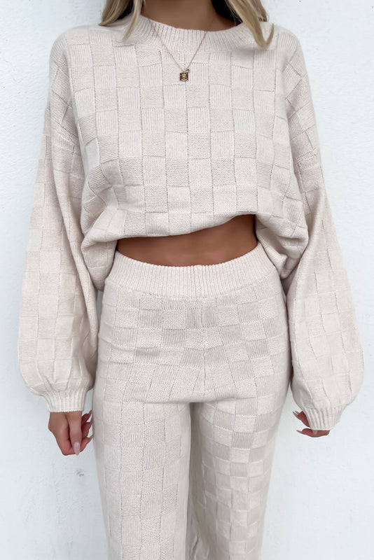 Sunday - The Eleanor Knit Jumper Cream with the matching Eleanor Knit Pant Cream and the Nightly Sherpa Slipper Beige White.
