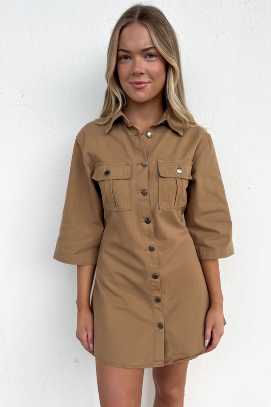 Saturday - The Josie Denim Mini Dress Taupe with the Link Chelsea Gusset Boot Bone and the State Of Mind Bag Chalk.
