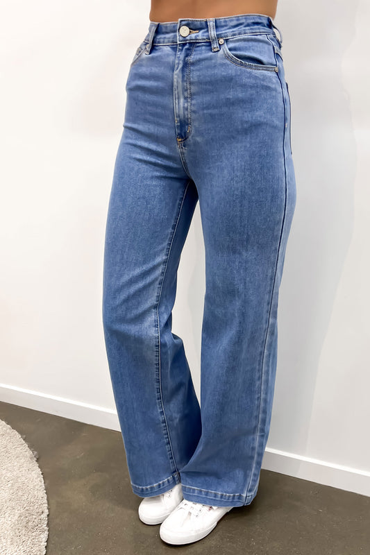 Look 1 - The June Cardigan Cream, the Alex Smooth Tee White, with the A 94 Wide Jean Peta and the Club C Double Revenge Shoe Chalk Oat.