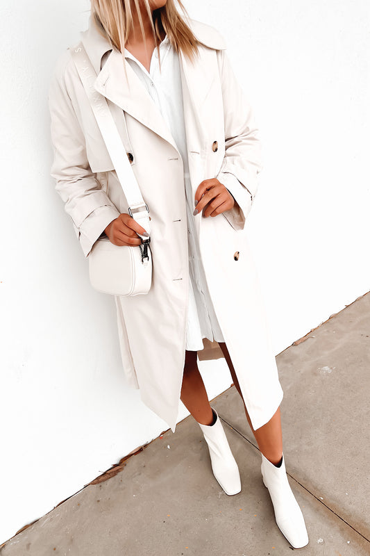 Don’t let the weather determine your outfit for your next event, you can still wear that dress you have been wanting to, just style it back with a trench coat to add that layer of style and warmth! That's what we have done here with the 'Odyssey Trench Coat Cloud' and the 'Jared Mini Dress White' and style it with the ‘Quinnie Boot Bone Scale’, the ‘Plunder With Webbed Strap Chalk’ and the 'Serena Felt Fedora Beige'.