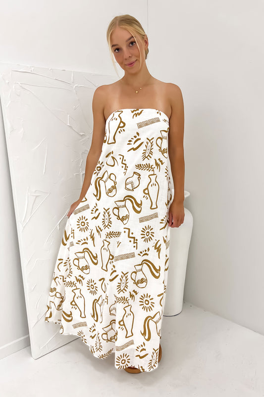 Outfit 2 - the next look is the 'Sloane Maxi Dress White Tan Aztec Vase', the 'Mattie Strappy Heel White Smooth' and the 'Lainy Necklace Gold'.