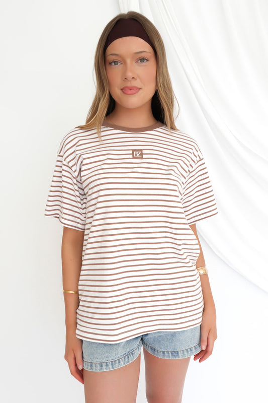 Effortlessly casual with a subtle edge, the Beau Stripe Tee in Brown Stripe pairs back perfectly with the Tatum Denim Short, the Thelma Flatform Slides Chocolate Brown, the Plunder With Webbed Strap Cocoa, the Eva Sunglasses Tort, and some gold jewellery.