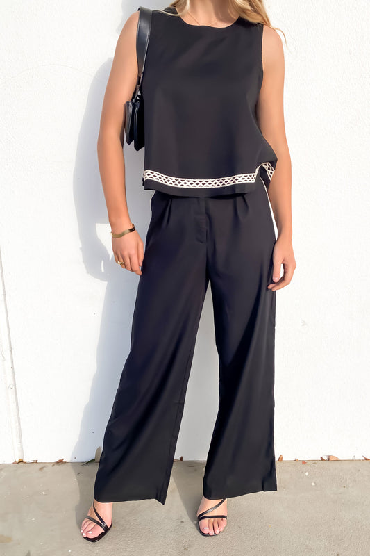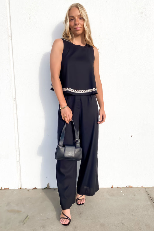 Elevate your look with the Cobie Top Black. Pair back with the Cobie Pant Black for the ultimate matching set! We've added the Mya Leather Sandal Black, the New Beat Bag Black + some gold jewellery.