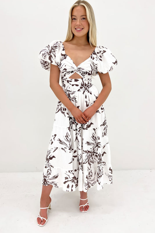 Look 1 - Lana Midi Dress White Brown + Rochelle Heel Espresso + Lainy Necklace Gold