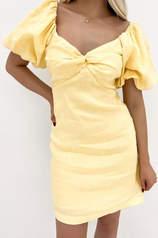 Look vibrant and stylish in 'Jordana Mini Dress Yellow'. Featuring a cheerful yellow colourway, V neckline, detail at the bust, and short puff sleeves, you'll love the way this dress pairs with the 'Kitra Closed Toe Heel White Smooth', the 'Boba Pearl Bag', the 'Jodie Necklace Silver' and the 'Rumi Earrings Silver'.