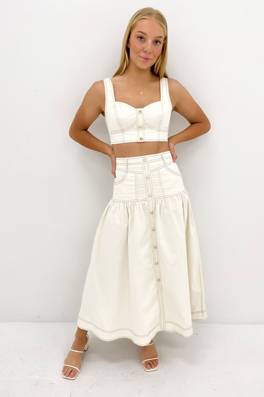 Look smokin' hot in the 'Cash Set Cream'! Make a statement with the cropped top and maxi skirt set, gold button details, and exposed gold zipper for a little extra drama. We love it paired back with the 'Kimmy Slim Strappy Heel White Smooth', the 'Carmel Necklace Gold' and a pair of gold statement earrings. Show off your unique style with this set!