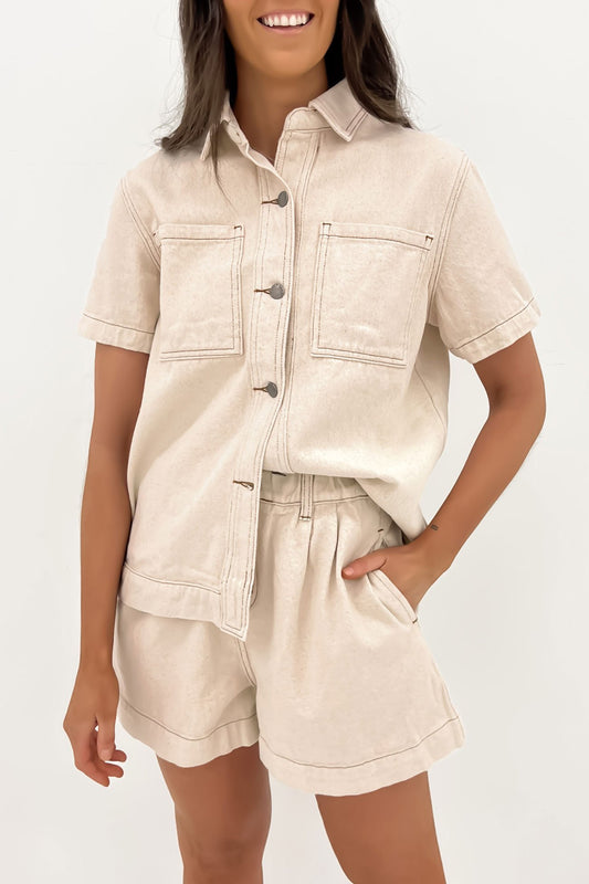 The Serina Denim Shirt and the Serina Denim Short styled with 2740 Platform Tumbled Leather White and the In Her Command Bag Tan, exudes effortless and casual chic. Perfect for a comfortable and stylish day out.