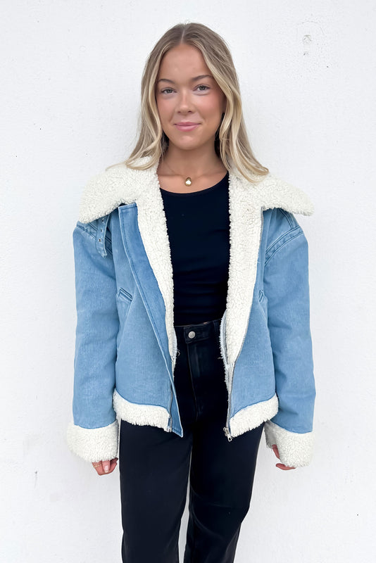 Look 3 - The Quinley Knit White with the Hilary Pant White, the Izzy Denim Sherpa Jacket Blue and the Orlin Clog Desert Suede.