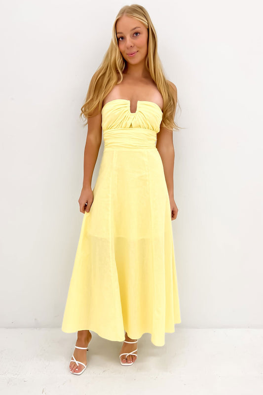 Next we have the Enya Maxi Dress Yellow. We have paired this back with the Otello Heel Bone and to finish the look off we accessorised with the Jodie Necklace Gold.