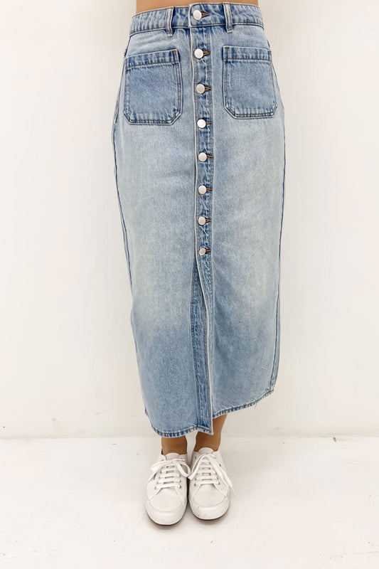 The 'Sailor Skirt Lyocell Blue' is what denim dreams are made of. Pair it back with the 'Ryker Halter Neck Crop Black', the 'Tayo Sandal Black', the 'Hunter Black Gold', the In Reverse Belt Black Gold', and the 'Elena Hoops Gold'. Love!
