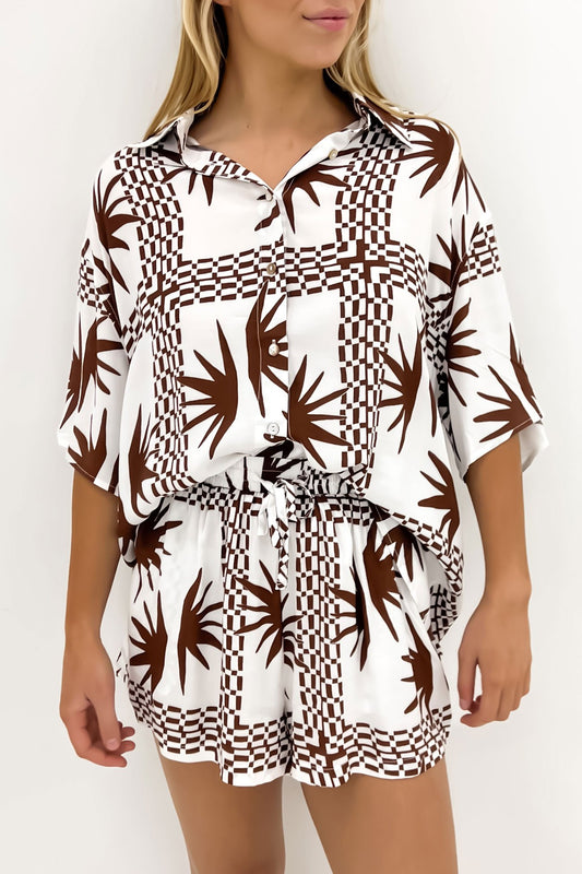 Step out in style with the Cabo Set! Featuring a chic brown and white pattern, this on-trend shirt and short set is sure to turn some heads. Elevate your style with this subtle yet eye-catching design. Here we have it paired back with the 'Declan Casual Slide White Smooth', the 'Catalina Hoops Gold', the 'Chloe Necklace Gold' and the 'Velodrome // White' sunglasses. Perfect for any occasion!