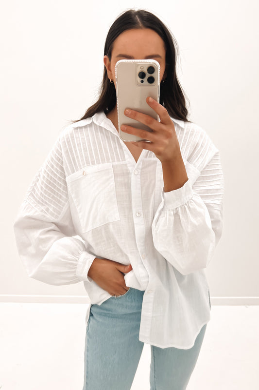 Our best selling Belle Shirt in white is paired back with our BY. ZAH Tatum Denim short in the colour Blue Haze. We have styled this look back with the Ceres sunglasses in Dark Tort, Verali Bosley Platform Thongs in the shade Chocolate Brown and to complete the look we have added the Odele Necklace, Ella Knot Earrings, Status Anxiety Polaris bag in Cocoa and the Status Anxiety Nocturne Belt in Chocolate Gold.