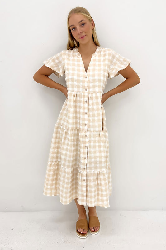 Here we have styled the 'Owen Midi Dress Latte Gingham' back with our current go-to wedge, the Callie Espadrille Wedges White Softee and the Chloe Necklace Gold.