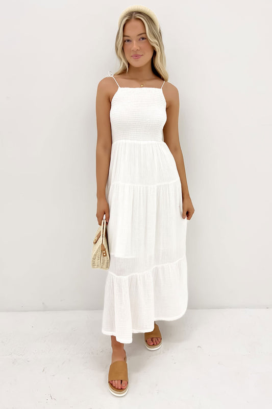 Next, we have the Rowie Maxi Dress Vintage White styled with the Dezzie Sandal Caramel Softee, the Nolan Rattan Bag Tan and the Amara Necklace Gold for a super cute summery look.
