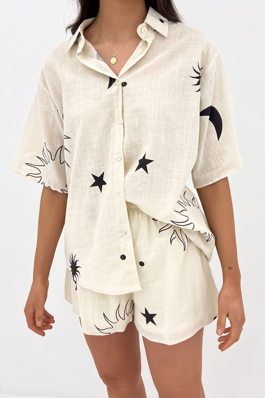 This stylish 'Malori Set Beige Black' is perfect for any summer outing. A collared button down shirt and shorts with an elasticated waistband and lining are sure to keep you comfortable. Complete your look by styling it with the 'Rascal Sandal White Smooth', the 'Staple Bag Black', and the 'Sylvie Sunglasses // White'.