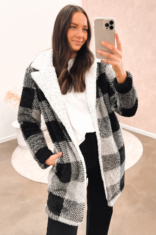 Look Two: The 'Sarayah Coat Multi', the 'Aspen Tee White', the 'Hi Mom Jean Baxter Black', and the 'Filo Chelsea Ankle Boot Black Softee'.
