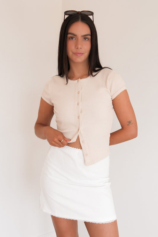 A fresh, feminine combo with a polished edge. The delicate Tommi Lace Tee in Blue pairs effortlessly with the Stacey Mini Skirt White, styled with the Katie Bag White, gold jewellery, and Stanford Block Heel Mules Chalk White for a chic, elevated look perfect for brunches, daytime events, or weekend outings.