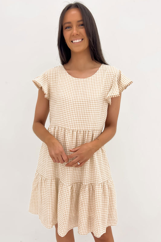 Elevate your style with the 'Bennie Mini Dress Latte Gingham'. Timeless and versatile, it boasts a flattering silhouette and classic pattern for a chic, sophisticated look! Pair it back with the 'Xylo Foot Bed Slide Biscuit Softee', the 'Look Both Ways Bag Tan', the 'Ella Sunglasses // Cream', and the 'Jassie Necklace Gold'.