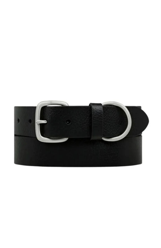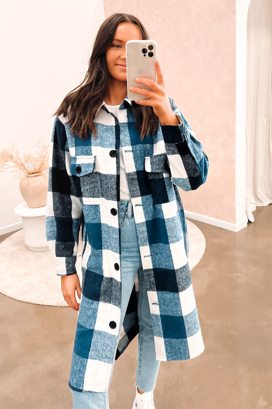 Look 2 - The Indi Shacket Blue Check with the Jordyn Rib Long Sleeve White, the Hi Wide Leg Jean Vintage Black with the Club C Double Revenge Shoe White Pure Grey 2 and the Disarm Belt Black Silver.