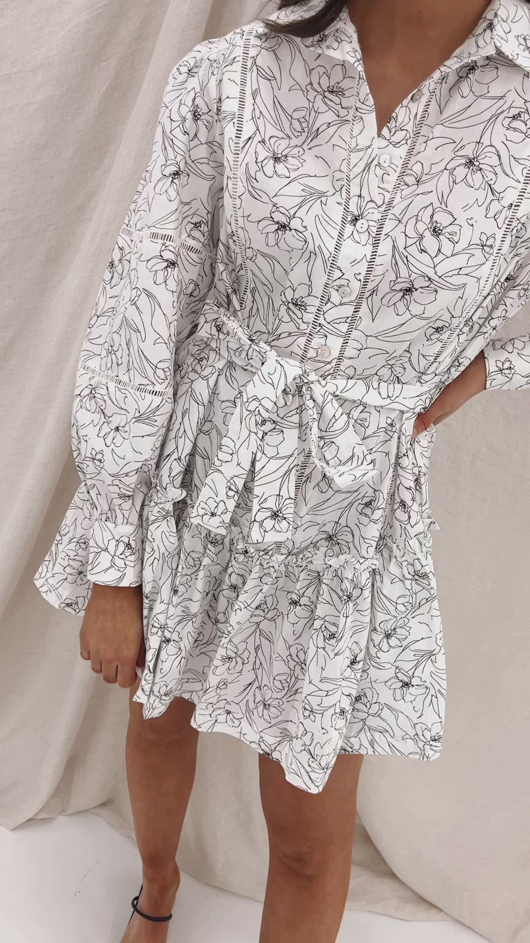 Stay stylish and classic in this Osprey Mini Dress. The white and black color combination makes for a timeless look, while the collared neckline, button down front, ruffled hem, long sleeves with cuffs, and tie at the waist with belt loops add fashion forward details.
